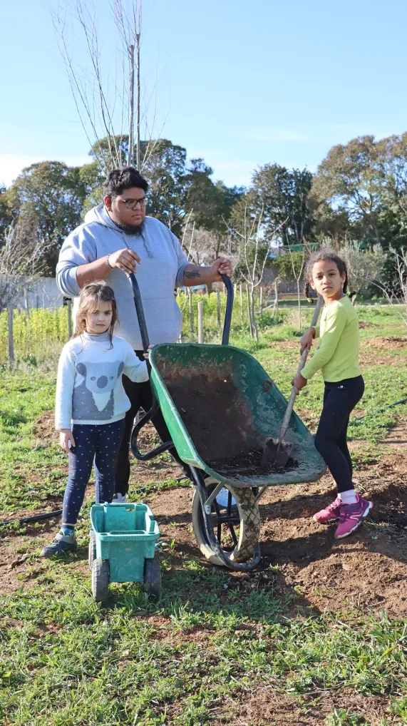 Deux enfants et un animateur avec une brouette mettent du compost au pied d'un arbre