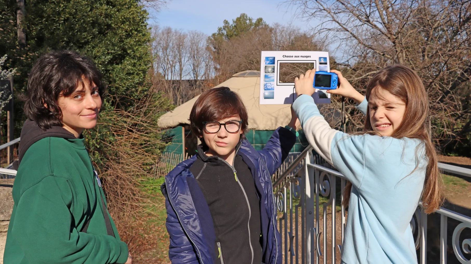 deux enfants et leur animatrice observent une feuille avec une loupe