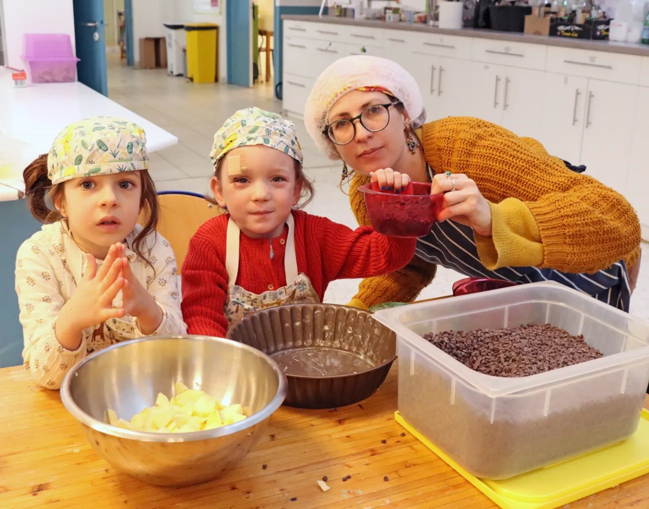 un groupe d'enfant et leurs animatrices avec charlottes et tabliers sont en cuisine