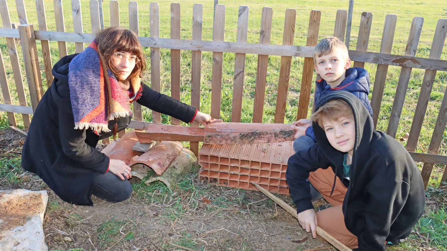 Un groupe d'enfants montrent les morceaux de papier qui vont devenir des briques
